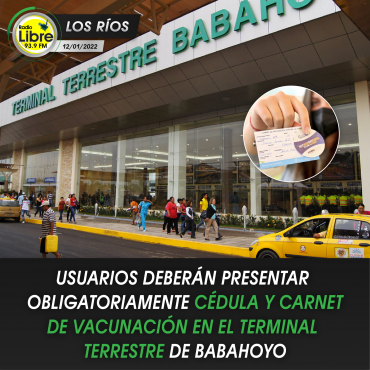 #Atención | Desde este miércoles 12 de enero de 2022 en el terminal terrestre de Babahoyo se pedirá al ingreso, cédula y carnet de vacunación contra el covid 19.